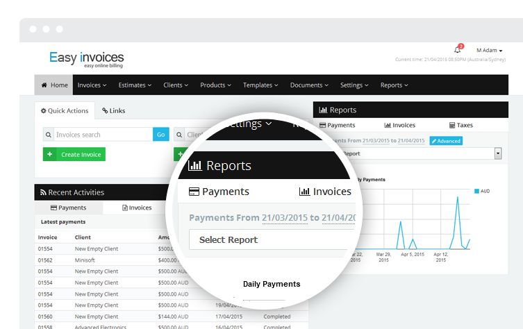 Invoice your clients simply and quickly via email. Online payment options support all forms of payment, and your system is automatically integrated with most popular payment gateways . (e.g. PayPal, Paymate ... etc)